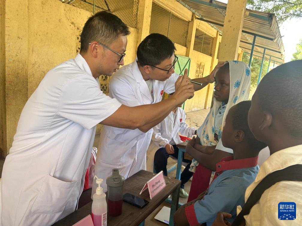 4月7日,在乍得首都恩贾梅纳的中乍友谊小学,中国医疗队医生为学生进行眼部检查(手机照片)。新华社发(第20批援乍得中国医疗队供图)