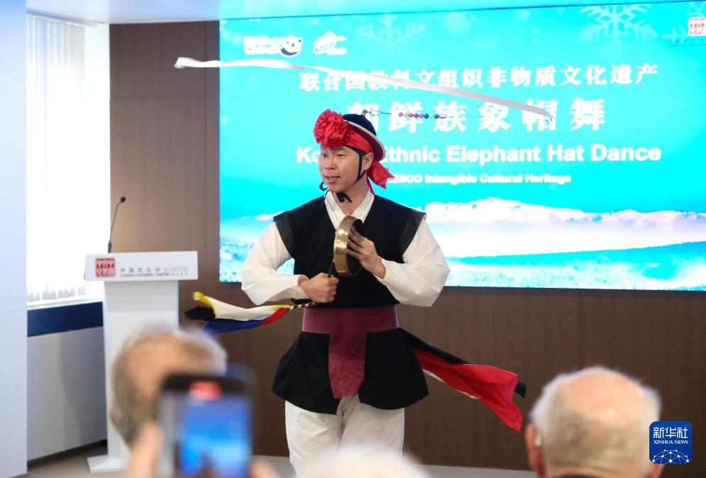 4月4日,在瑞士伯尔尼中国文化中心举行的“你好!中国”吉林省文旅推介会上,演员表演“象帽舞”。新华社记者马汝轩摄